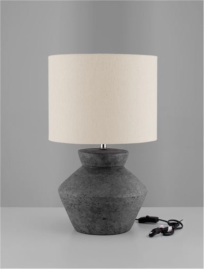 Lampă de masă elegantă Nova Luce PLUMAGE cu bază geometrică solidă din ceramică într-o nuanță elegantă, gri închis. Estetica sa brută este echilibrată de un abajur din material clasic, strălucitor. Ideala pentru interioare industriale, moderne sau minimaliste, va fi perfecta in living, dormitor sau birou ca element de iluminat practic si decorativ.