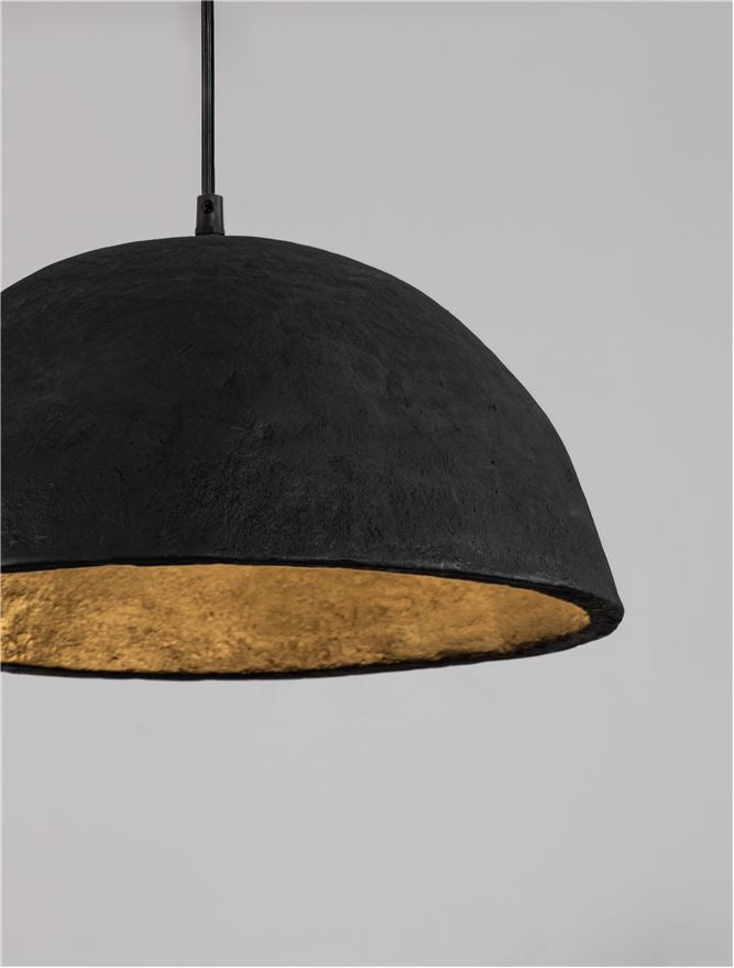 Lampă elegantă Nova Luce TALCUM cu abajur semisferic, negru, realizată folosind tehnica hârtiei machée. Designul său brut, minimalist se potrivește perfect în aranjamentele în stil loft, industrial sau modern. Se potrivește perfect sufrageriei, camerei de zi sau dormitorului. O combinație subtilă de funcționalitate și caracter expresiv.